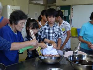 玉ねぎの皮を煮て、こした液につけ、その後ミョウバン液につけます。きつく縛ってあるので解くのが大変!