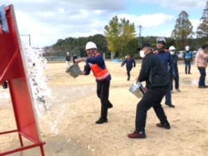 11月19日(日曜日)午前に高泊小学校グラウンドにて高泊地区の防災訓練が行われました。 各地区より集まった人々は、まず身をかがめて頭を守る体制を行った後、3つのグループに分かれて、バケツリレー、煙訓練、水消火器を使った消火活動をこなし、最後に炊き出しのカレーをみんなでいただきました。 何度も行った活動ですが、「反復」することで身につき、いざという時役立ちます。