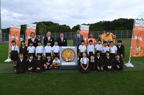 (お披露目式に来ていただいた高泊小学校の皆さんと記念写真)