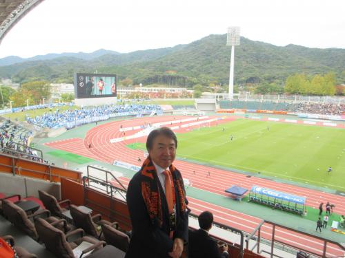 レノファ山口の今シーズンの最終戦が行われ、県知事と県内の市長、町長等が集まって応援しました。対戦相手は、横浜FCでした。試合は、0-0の引き分けとなりましたが、多くのサポーターで盛り上がっていました。