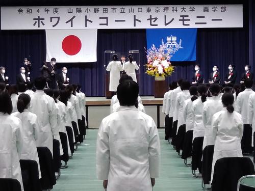山口東京理科大学の薬学部実務実習生の実務実習を開始するにあたり、実務実習生124名を対象に、ホワイトコートセレモニー(白衣授与式)が開催されました。