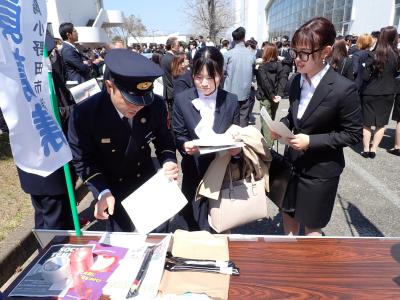 団本部の女性消防団員、学生消防団員が新入生の方々に募集チラシを配布し、学生消防団員の活動概要やメリットを説明しました。
